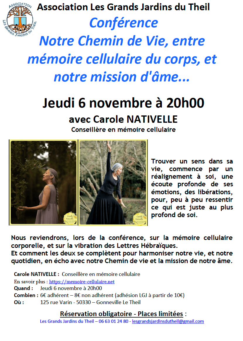 Conférence : « notre Chemin de Vie, entre mémoire cellulaire du corps, et notre mission d’âme… » avec Carole NATIVELLE, Conseillère en mémoire cellulaire le Jeudi 6 novembre 2025 à 20h00